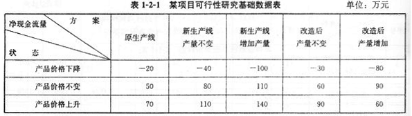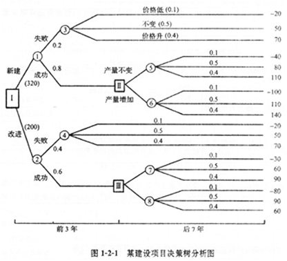 | 1.某建設項目可行性研究階段擬定了兩個生產線方案,項目實施期為10年。 方案1:對原有生產線進行改造,投資200萬元,改造成功的概率為0.6。改造后前三年為投產試營期,綜合風險變化因素與生產效率預計每年凈現金流量為50萬元。 方案2:安裝新生產線,投資320萬元,項目成功概率為0.8。安裝后前3年為投產試營期,預計每年凈現金流量為60萬元。 若方案1、方案2均不成功,擬采用原生產線生產,并保持原生產線 水平(相關數據見表1-2-1)。兩方案設計效果有可能使產量增加或不變。根據市場調研,今后10年內產品的價格下跌的概率為0.1,保持不變的可能性為0.5,價格上升的概率為0.4。 問題:假設今后10年內行業基準收益率為12%,以10年為項目計算期,試用決策樹分析法對上述方案進行評價。 |