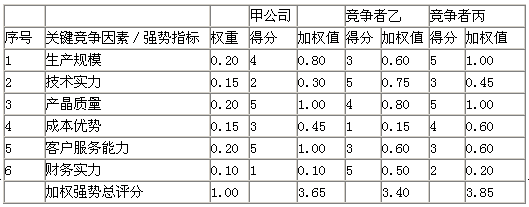 1.甲公司目前主營產品為A,A產品所在行業競爭者眾多,占有市場份額最高的企業的市場份額為18%,且行業內主要企業的份額比率均在1.7以內。甲公司同兩個主要競爭對手乙公司和丙公司的競爭態勢矩陣如表1-1所示。