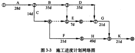 | 正確答案: 1.本工程計劃總工期=(28+35+35+21+21)d=140d,實際總工期=(140+10+7)d=157d。 2.施工總承包單位可否就事件1~3獲得工期索賠的判定及其理由: 事件1可以獲得工期索賠。 理由:A工作是因設計變更而停工,應由建設單位承擔責任,且A工作屬于關鍵工作。 事件2不可以獲得工期索賠。 理由:B工作是因施工質量問題返工,應由施工總承包單位承擔責任。 事件3不可以獲得工期索賠。 理由:E工作雖然是因建設單位供料延期而推遲施工,但E工作不是關鍵工作,且推遲3d未超過其總時差。 1. 計算截止到第110d的合計BCWP值,見表3-38: ![]() 截止到第110d的合計BCWP值為2900萬元。 4.第110d的成本偏差CV=BCWP-ACWP=(2900-2510)萬元=390萬元。 CV值結論分析:由于成本偏差為正,說明成本節約390萬元。 5.第110d的進度偏差SV=BCWP-BCWS=(2900-3710)萬元=-810萬元。 SV值結論分析:由于進度偏差為負,說明進度延誤了810萬元。 |