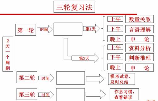 國考也不例外。在國考復習過程中,我們也建議大家按照“三輪復習法”來復習。因為“三”在我國的傳統文化中有兩層含義,一是指“概數”,意即“多”的意思,如“吾日三省吾身”、“白發三千丈”、“冰凍三尺非一日之寒”等等;一是表示有“輪回”的寓意,如“三生有幸”等。按照“三輪”的方法來復習、備考,具體的意思可以用下面的圖表形式來表示: