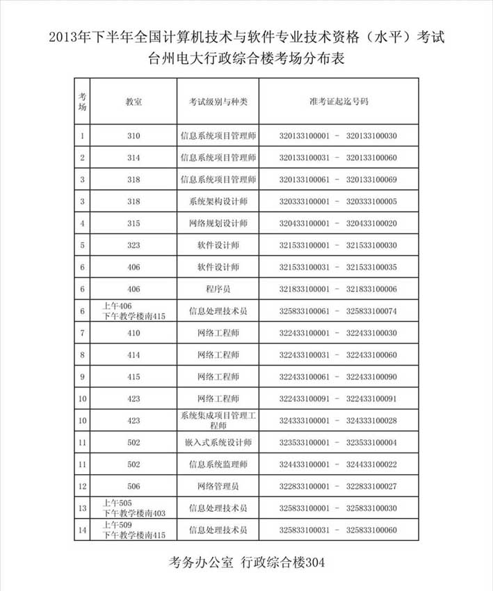 2013年下半年臺(tái)州計(jì)算機(jī)考試考場分布表