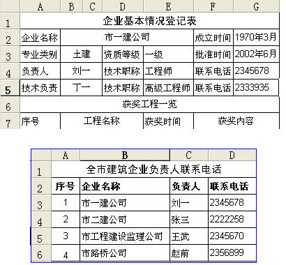 在工作簿中插入一個新工作表,并將該工作表命名為“通訊錄”,合并A1―D1單元格,在合并后的單元格中輸入“全市建筑企業負責人聯系電話”。分別在A2、B2、C2、D2單元格中輸入“序號”、“企業名稱”、“負責人”、“聯系電話”等字段。