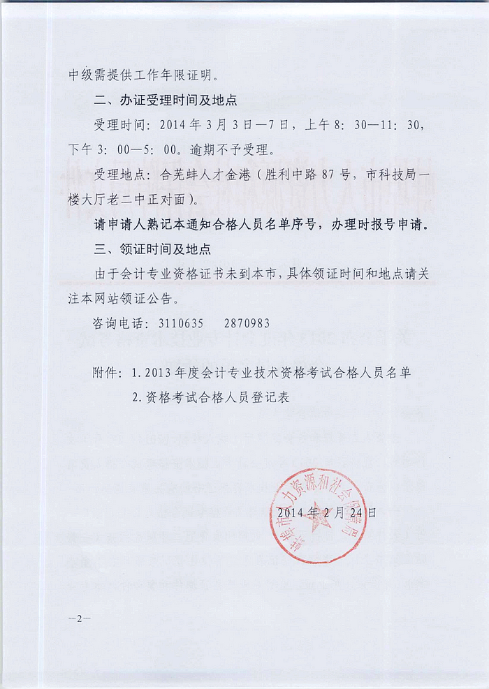關于公布2013年度會計專業技術資格考試合格人員名單的通知(蚌人社才[2014]5號)