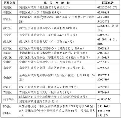 (一)領取初級資格證書確認所屬區縣財政局,請查詢成績單上的發證編號,如1310-0451-2-00427,代碼為:0451徐匯區、0551長寧區、0651靜安區、0751普陀區、0851閘北區、0951虹口區、1051楊浦區、1251閔行區、1351寶山區、1451浦東新區(不含惠南)、1951黃浦區、2251嘉定區、2551浦東新區(惠南)、2651奉賢區、2751松江區、2851金山區、2951青浦區、3051崇明縣。
