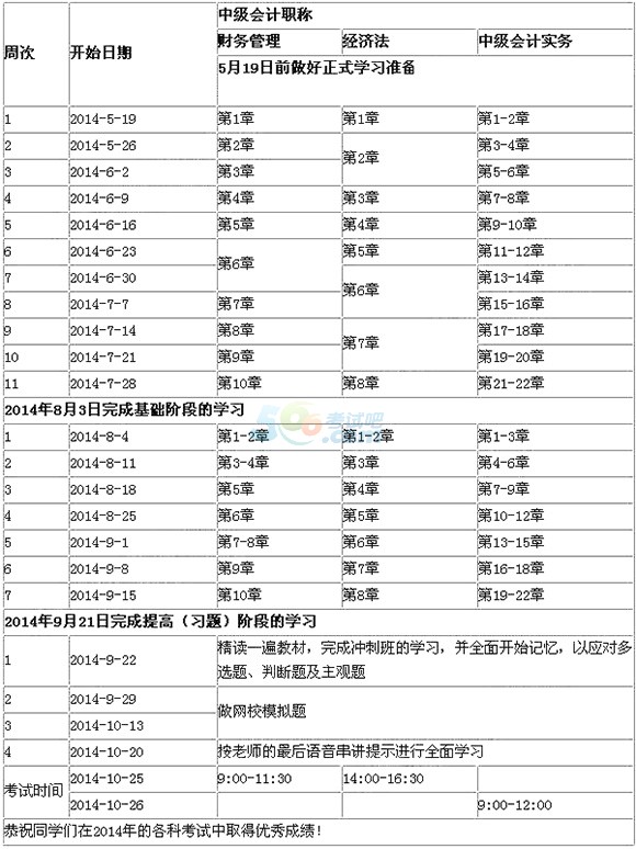 為幫助同學(xué)們順利完成2014年中級會計師學(xué)習(xí),我們制定了這份學(xué)習(xí)計劃表,以方便同學(xué)們對今后5個月的學(xué)習(xí)進度進行全面控制,達到較好的學(xué)習(xí)效果。