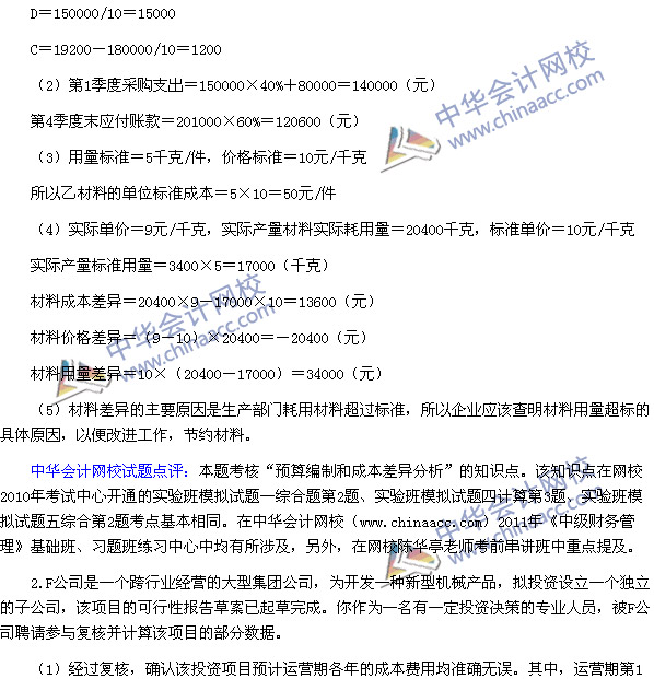 一、單項選擇(本類題共25小題,每小題1分,共25分,每小題備選答案中,只有一個符合題意的正確答案。請將選定的答案,按答題卡要求,用2B鉛筆填涂答案卡中題號1至25信息點。多選,錯選,不選均不得分)。 1.下列各項中,屬于商業信用籌資方式的是( )。 A.發行短期融資券 B.應付賬款籌資 C.短期借款 D.融資租賃 參考答案:B 百分百考試網校答案解析:商業信用是指企業在商品或勞務交易中,以延期付款或預收貨款方式進行購銷活動而形成的借貸關系,是企業之間的直接信用行為,也是企業短期資金的重要來源。商業信用的形式包括:應付賬款、應計未付款和預收貨款,所以本題正確答案為B.參見教材174~176頁。 百分百考試網校試題點評:本題考核“商業信用”這個知識點。該知識點與網校2011年考試中心開通的實驗班模擬試題二單選第12題、普通班模擬試題五單選第15題考點基本相同。在2011年“夢想成真”系列輔導叢書之《應試指南。中級財務管理》119頁例題17單選題、《經典題解。中級財務管理》118頁隨堂演練(五)第1題單選題基本一致。在百分百考試網校(www.chinaacc.com)2010年《中級財務管理》基礎班、習題班練習中心中均有所涉及,另外,在網校陳華亭老師考前串講班中重點提及。 2.某公司月成本考核例會上,各部門經理正在討論、認定直接人工效率差異的責任部門。根據你的判斷,該責任部門應是( )。 A.生產部門 B.銷售部門 C.供應部門 D.管理部門 參考答案:A 百分百考試網校答案解析:直接人工效率差異是效率差異,其形成的原因是多方面的,工人技術狀況、工作環境和設備條件的好壞等,都會影響直接人工效率的高低,但其主要責任還是在生產部門,所以本題正確答案為A.參見教材203頁。 百分百考試網校試題點評:本題考核“直接人工差異形成的原因”這個知識點。該知識點與網校2011年考試中心開通的普通班模擬試題四單選第18題、普通班模擬試題五單選第24題考點基本相同。在2011年“夢想成真”系列輔導叢書之《應試指南。中級財務管理》142頁例題13多選題、《經典題解。中級財務管理》156頁單選題第22題基本一致。在百分百考試網校(www.chinaacc.com)2010年《中級財務管理》基礎班、習題班練習中心中均有所涉及,另外,在網校陳華亭老師考前串講班中重點提及。 3.某公司非常重試產品定價工作,公司負責人強調,產品定價一定要正確反映企業產品的真實價值消耗和轉移,保證企業簡單再生產的繼續進行。在下列定價方法中,該公司不宜采用的是( )。 A.完全成本加成定價法 B.制造成本定價法 C.保本點定價法 D.目標利潤定價法 參考答案:B 百分百考試網校答案解析:制造成本是指企業為生產產品或提供勞務等發生的直接費用支出,一般包括直接材料、直接人工和制造費用。由于它不包括各種期間費用,因此不能正確反映企業產品的真實價值消耗和轉移。利用制造成本定價不利于企業簡單再生產的繼續進行,所以本題正確答案為B.參見教材188頁。 百分百考試網校試題點評:本題考核“產品定價方法”的知識點。該知識點在網校2011年考試中心開通的實驗班模擬試題五單選題第18題考點基本相同。在2011年“夢想成真”系列輔導叢書之《經典題解。中級財務管理》138頁隨堂演練(二)第2題單選題基本一致。在百分百考試網校(www.chinaacc.com)2011年《中級財務管理》基礎班、習題班練習中心中均有所涉及,另外,在網校陳華亭老師考前串講班中重點提及。 4.股利的支付可減少管理層可支配的自由現金流量,在一定程度上和抑制管理層的過度投資或在職消費行為。這種觀點體現的股利理論是( )。 A.股利無關理論 B.信號傳遞理論 C."手中鳥"理論 D.代理理論 參考答案:D 百分百考試網校答案解析:代理理論認為股利政策有助于緩解管理者與股東之間的代理沖突。股利的支付能夠有效地降低代理成本。首先,股利的支付減少了管理者對自由現金流量的支配權,這在一定程度上可以抑制公司管理者的過度投資或在職消費行為(所以選項D的說法正確),從而保護外部投資者的利益;其次,較多的現金股利發放,減少了內容融資,導致公司進入資本市場尋求外部融資,從而公司將接受資本市場上更多的、更嚴格的監督,這樣便能通過資本市場的監督減少了代理成本。參見教材214頁。 百分百考試網校試題點評:本題考核“股利分配政策”的知識點。該知識點在網校2011年考試中心開通的實驗班模擬試題五單選題第24題、普通班模擬試題一判斷題第8題考點基本相同。在2011年“夢想成真”系列輔導叢書之《應試指南。中級財務管理》158頁單選題第22題考點基本一致。在百分百考試網校(www.chinaacc.com)2011年《中級財務管理》基礎班、習題班練習中心中均有所涉及,另外,在網校陳華亭老師考前串講班中重點提及。 5. 下列關于成本動因(又稱成本驅動因素)的表述中,不正確的是( )。 A.成本動因可作為作業成本法中的成本分配的依據 B.成本動因可按作業活動耗費的資源進行度量 C.成本動因可分為資源動因和生產動因 D.成本動因可以導致成本的發生 參考答案:C 百分百考試網校答案解析:成本動因亦稱成本驅動因素,是指導致成本發生的因素,所以選項D的說法正確;成本動因通常以作業活動耗費的資源來進行度量,所以選項B的說法正確;在作業成本法下,成本動因是成本分配的依據,所以選項A的說法正確