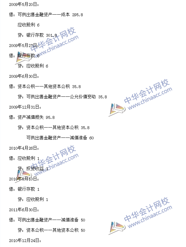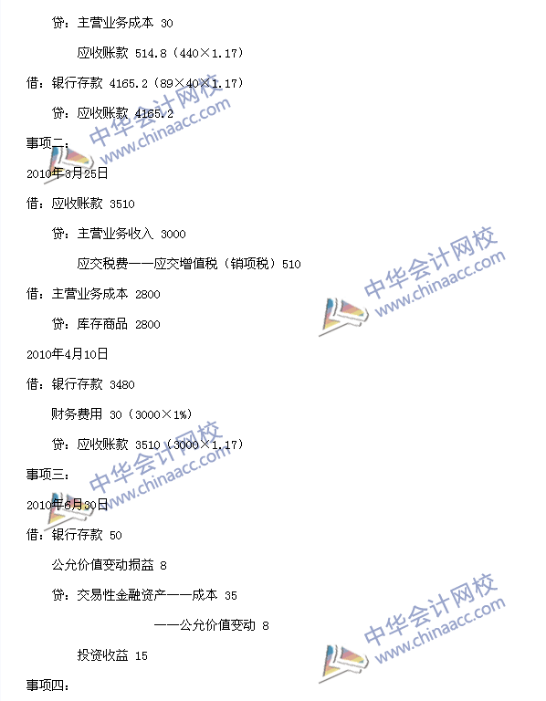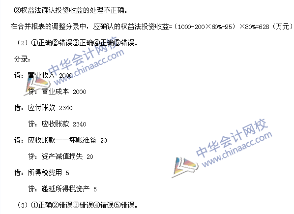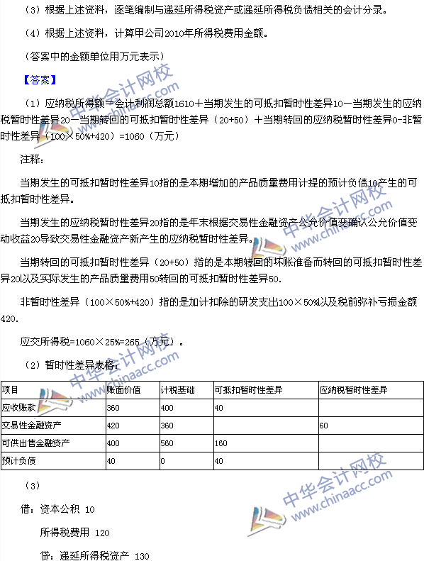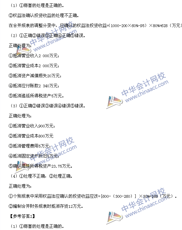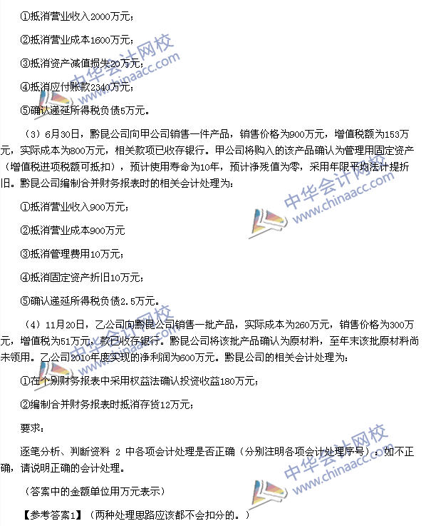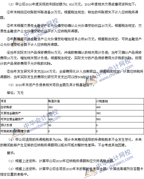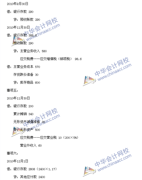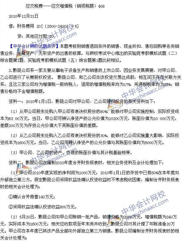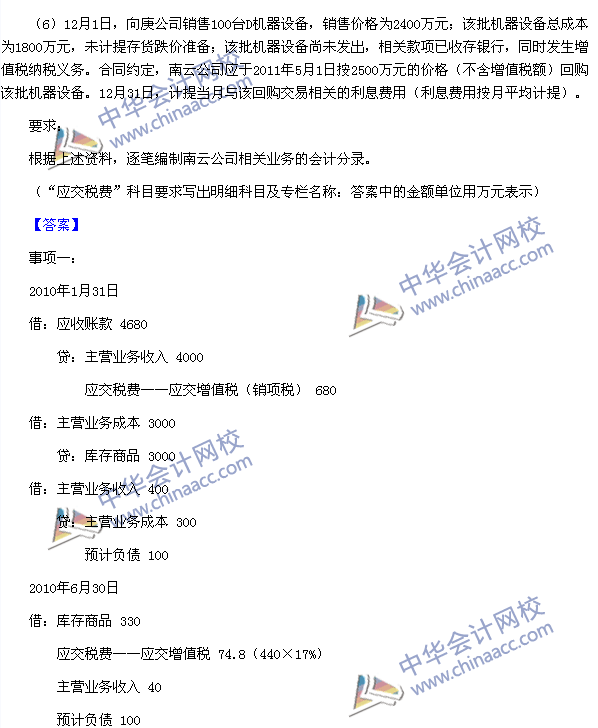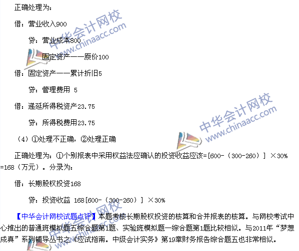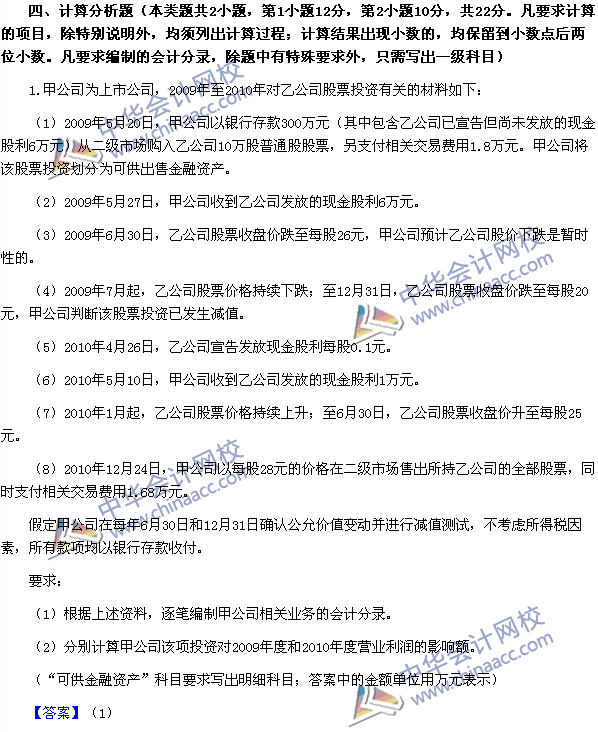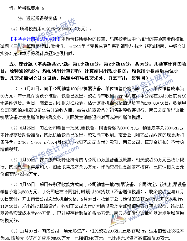 一、單項選擇題(本類題共15小題,每小題1分,共15分。每小題備選答案中,只有一個符合題意的正確答案。請將選定的答案,按答題卡要求,用2B鉛筆填涂答題卡中題號1至15信息點,多選、錯選,不選均不得分。) 1.下列各項外幣資產發生的匯兌差額,不應計入當期損益的是( )。 A.應收賬款 B.交易性金融資產 C.持有至到期投資 D.可供出售權益工具投資 【答案】D 【百分百考試網校答案解析】選項A,計入財務費用,選項B,計入公允價值變動損益,選項C,計入財務費用,選項D,計入資本公積。 【百分百考試網校試題點評】本題考核“匯兌差額”知識點,該知識點與網校2011年考試中心競賽試題二多選第10題、2011年習題班練習中心第16章判斷第1題考點基本相同。 2.下列關于會計估計及其變更的表述中,正確的是( )。 A.會計估計應以最近可利用的信息或資料為基礎 B.對結果不確定的交易或事項進行會計估計會削弱會計信息的可靠性 C.會計估計變更應根據不同情況采用追溯重述或追溯調整法進行處理 D.某項變更難以區分為會計政策變更和會計估計變更的,應作為會計政策變更處理 【答案】A 【百分百考試網校答案解析】選項B,會計估計變更不會削弱會計信息的可靠性;選項C,會計估計變更應采用未來適用法;選項D,應該作為會計估計變更處理。 【百分百考試網校試題點評】本題考核“會計估計變更”知識點。該知識點與網校2011年考試中心開通的實驗班模擬試題三判斷題8題,普通班模擬試題二判斷8題,普通班模擬試題三多選8題、2011年基礎班練習中心第17章多選第2題考點基本相同。 3.2010年12月31日,甲公司對一起未決訴訟確認的預計負債為800萬元。2011年3月6日,法院對該起訴訟判決,甲公司應賠償乙公司600萬元;甲公司和乙公司均不再上訴。甲公司的所得稅稅率為25%,按凈利潤的10%提取法定盈余公積,2010年度財務報告批準報出日為2011年3月31日,預計未來期間能夠取得足夠的應納稅所得額用以抵扣可抵扣暫時性差異。不考慮其他因素,該事項導致甲公司2010年12月31日資產負債表“未分配利潤”項目“期末余額”調整增加的金額為( )萬元。 A.135 B.150 C.180 D.200 【答案】A 【百分百考試網校答案解析】賬務處理如下: 借:預計負債 800 貸:以前年度損益調整 200 其他應付款600 借:以前年度損益調整——調整所得稅費用200 貸:遞延所得稅資產200 借:應交稅費——應交所得稅150 貸:以前年度損益調整 ——調整所得稅費用150 借:以前年度損益調整 150 貸:盈余公積 15 利潤分配——未分配利潤 135 【百分百考試網校試題點評】本題考核“日后未決訴訟結案”知識點,該知識點與網校2011年全真模擬試卷五綜合題2題,應試指南284頁計算分析題第1題、2011年習題班練習中心第8章單選題第7題考點基本相同。 百分百考試網校 4.2011年4月1日,甲事業單位采用融資租賃方式租入一臺管理用設備并投入使用。租賃合同規定,該設備租賃期為5年,每年4月1日支付年租金100萬元,租賃期滿后甲事業單位可按1萬元的優惠價格購買該設備。當日,甲事業單位支付了首期租金。甲事業單位融資租入該設備的入賬價值為( )萬元。 A.100 B.101 C.500 D.501 【答案】D 【百分百考試網校答案解析】賬務處理如下: 借:固定資產 501 貸:其他應付款 501 【百分百考試網校試題點評】本題考核“事業單位融資租入固定資產入賬價值”知識點,該知識點與網校2011全真模擬試卷四單選15題,經典題解317頁第2題考點基本相同。 5.投資性房地產的后續計量從成本模式轉為公允價值模式的,轉換日投資性房地產的公允價值高于其賬面價值的差額會對下列財務報表項目產生影響的是( )。 A.資本公積 B.營業外收入 C.未分配利潤 D.投資收益 【答案】C 【百分百考試網校答案解析】投資性房地產由成本模式轉為公允價值模式,應該作為會計政策變更處理,公允價值與價值的差額應計入留存收益。所以選擇C選項。 【百分百考試網校試題點評】本題考核“投資性房地產核算模式轉換”知識點。該知識點與網校2011年考試中心開通的實驗班模擬試題二判斷題6題,實驗班模擬試題五多選8題、2011年基礎班練習中心第4章單選第11題考點基本相同。 6.2010年12月31日,甲公司建造了一座核電站達到預定可使用狀態并投入使用,累計發生的資本化支出為210 000萬元。當日,甲公司預計該核電站在使用壽命屆滿時為恢復環境發生棄置費用10 000萬元,其現值為8 200萬元。該核電站的入賬價值為( )萬元。 A.200 000 B.210 000 C.218 200 D.220 000 【答案】C 【百分百考試網校答案解析】分錄為: 借:固定資產 218200 貸:在建工程 210000 預計負債 8200 【百分百考試網校試題點評】本題考核“存在棄置費用的固定資產入賬價值”知識點。該知識點與網校2011年考試中心開通的實驗班模擬試題一判斷題2題考點基本相同。 7.下列各項中,影響長期股權投資賬面價值增減變動的是( )。 A.采用權益法核算的長期股權投資,持有期間被投資單位宣告分派股票股利 B.采用權益法核算的長期股權投資,持有期間被投資單位宣告分派現金股利 C.采用成本法核算的長期股權投資,持有期間被投資單位宣告分派股票股利 D.采用成本法核算的長期股權投資,持有期間被投資單位宣告分派現金股利 【答案】B 【百分百考試網校答案解析】選項B的分錄為: 借:應收股利 貸:長期股權投資 【百分百考試網校試題點評】本