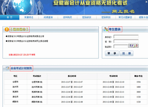 通過安徽省會計網(wǎng)提供的鏈接進入網(wǎng)上報名服務大廳首頁。首頁左上部是關(guān)于會計考試的通知公告,右上部是登錄和注冊功能,首頁下方是全省考試計劃預覽,考生可以查詢所有考區(qū)公布的考試計劃的報名時間,考試時間,剩余考位等信息,如下圖所示: