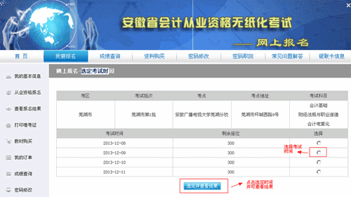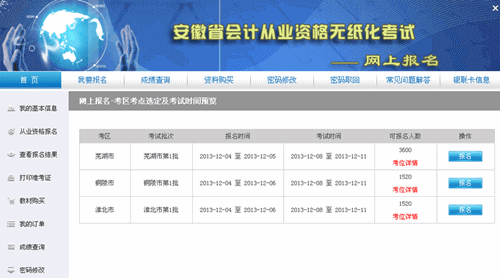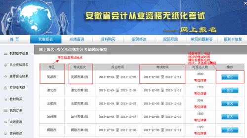 注冊完成或直接登錄就會進入正式報名流程,第一步是選擇考試批次,考生可以通過考區(qū)和考試時間來選擇考試批次,確定要報名的考試批次后,在這個批次中,點擊報名按鈕,即可報名這個考試批次了。如圖所示: