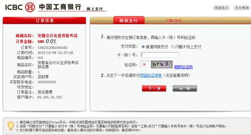 點擊確認支付按鈕后會彈出工行繳費平臺頁面,考生就可以進行網(wǎng)上繳費了,如下圖: