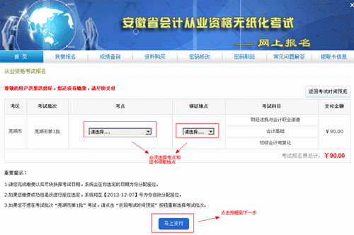 選擇好考試批次點擊報名后跳轉(zhuǎn)到繳費支付頁面,考生須選擇考點和領(lǐng)取資格證書地點,然后點擊馬上支付按鈕到下一步,如圖所示: