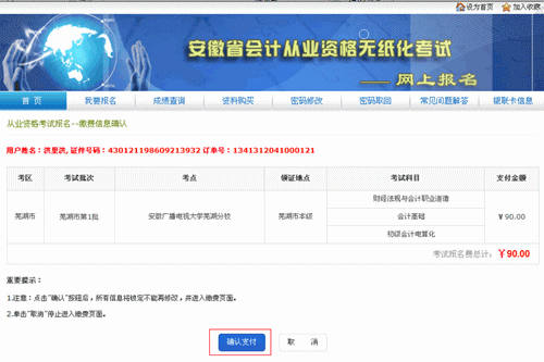 選擇考點和領(lǐng)證地點后,跳轉(zhuǎn)到確認支付頁面,請考生確認自己的報名信息無誤后,點擊確認支付按鈕,如下圖:
