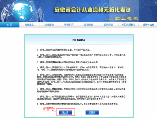 點擊注冊按鈕后跳轉(zhuǎn)到網(wǎng)上報名協(xié)議頁面,請考生詳細閱讀報名協(xié)議,如同意協(xié)議點擊同意按鈕到下一步,如下圖: