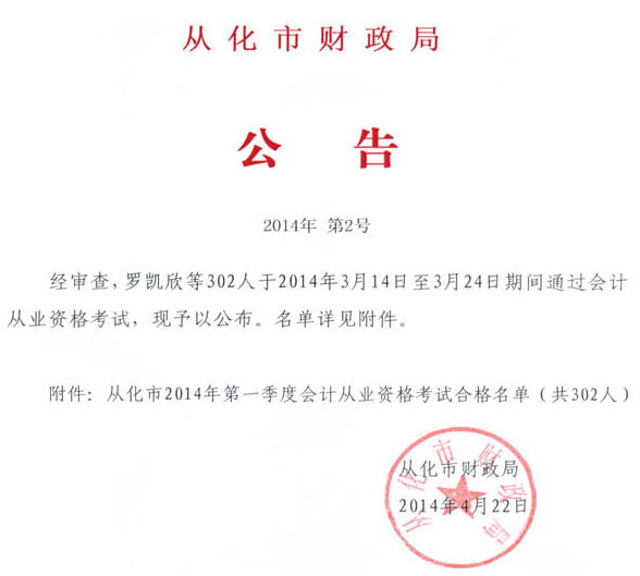 從化市2014年第一季度會(huì)計(jì)從業(yè)資格考試合格名單