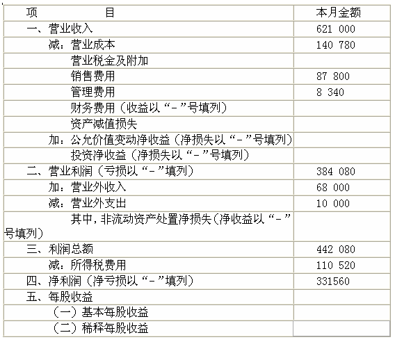 | 正確答案: (1) 借:庫存現金 30 000 會計從業考試 貸:銀行存款 30 0000 (2) 借:營業外支出 10 000 貸:銀行存款 10 000 (3) 借:銀行存款 200 000 貸:應收賬款 200 000 (4) 借:固定資產 50 000 貸:銀行存款 50 000 (5) 借:其他應收款 5 600 貸:庫存現金 5 600 (6) 借:原材料 80 200 貸:應付賬款 80 000 應付職工薪酬 200 (解析:入庫后的挑選整理費200元,為員工勞務支出,所以計入“應付職工薪酬”。) (7) 借:銀行存款 68 000 貸:營業外收入 68 000 (8) 借:應交稅費—應交所得稅 7 000 貸:銀行存款 7 000 (9) 借:銷售費用 60 000 貸:庫存現金 60 000 (10) 借:制造費用 4 200 庫存現金 1 400 貸:其他應收款 5 600 (解析:車間管理人員差旅費應計入制造費用) (11) 借:應收賬款 1 000 貸:其他業務收入 1 000 (12) 借:管理費用 300 貸:現金 300 (13) 借:應收票據 620 000 貸:主營業務收入 620 000 (14) 借:生產成本 300 000 制造費用 10 000 銷售費用 5 000 管理費用 1 200 貸:原材料 316 200 (15) 借:生產成本 32 000 制度費用 18 000 銷售費用 20 000 管理費用 6 000 貸:應付職工薪酬 76 000 (16 借:生產成本 4 480 制度費用 2 520 銷售費用 2 800 管理費用 840 貸:應付職工薪酬 10 640 (17) 借:生產成本 34 720(4 200+10 000+18 000+2 520) 貸:制造費用 34 720(4 200+10 000+18 000+2 520) (18) 借:庫存商品 371 200(300 000+32 000+4 480+34 720) 貸:生產成本 371 200(300 000+32 000+4 480+34 720) (19) 借:主營業務成本 140 330 貸:庫存商品 140 330 (20) 借:其他業務成本 450 貸:原材料 450 (21) 借:主營業務收入 620 000 其他業務收入 1 000 營業外收入 68 000 貸:本年利潤 689 000 (22) 借:本年利潤 246 920 貸:主營業務成本 140 330 其他業務成本 450 管理費用 8 340 銷售費用 87 800 營業外支出 10 000 (23) 借:所得稅費用 110 520 貸:應交稅費—應交所得稅 110 520 (24) 借:本年利潤 110 520 貸:所得稅費用 110 520 2.利潤表 2009年6月 ![]() |