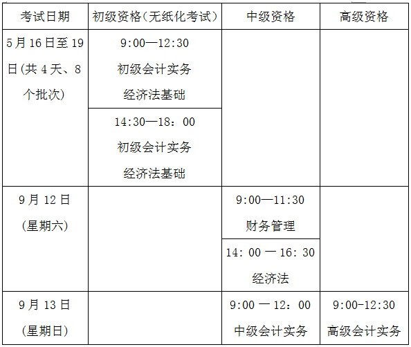 全國會計專業(yè)技術(shù)資格初、中、高級各級別、各科目具體考試時間及批次如下:(圖表一)