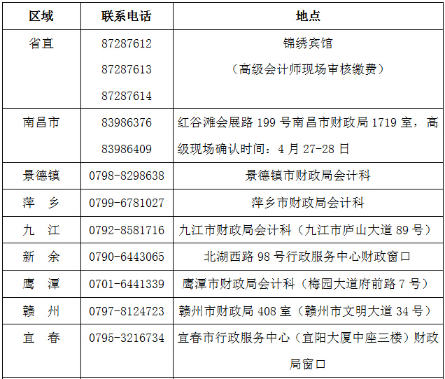 報名參加會計專業(yè)技術(shù)資格考試時,登陸江西省財政廳綜合信息網(wǎng)(http://www.jxf.gov.cn)或江西會計網(wǎng)(http://acc.jxf.gov.cn)會計專業(yè)技術(shù)資格考試報名入口,根據(jù)相應(yīng)級別報名條件規(guī)定,填寫報考人員登記表,上傳照片,照片審核通過后,初、中級會計專業(yè)資格網(wǎng)上支付報名費,并在網(wǎng)上訂書及繳付訂書款,報名成功后打印報名信息表和報名回執(zhí)表。報名成功的考生如需開具發(fā)票,在報名結(jié)束后到現(xiàn)場報名點領(lǐng)取,具體時間以各地財政局公告為準。高級會計師資格報名考生,在4月27-28日,攜帶網(wǎng)上打印的考生報名信息表、會計從業(yè)資格證、學歷證書、會計中級資格證書、單位中級專業(yè)技術(shù)職務(wù)聘書、身份證、學歷查詢認證證明(需加蓋公章,有關(guān)要求見后文)等材料原件及復(fù)印件前往現(xiàn)場報名點進行報名資格審查、交費?,F(xiàn)場報名點見圖表二。