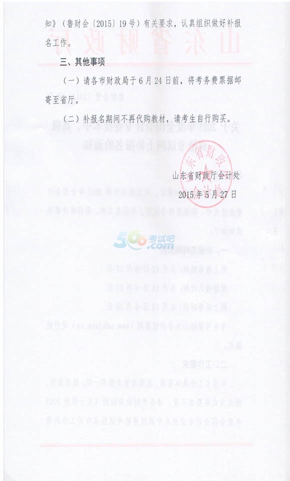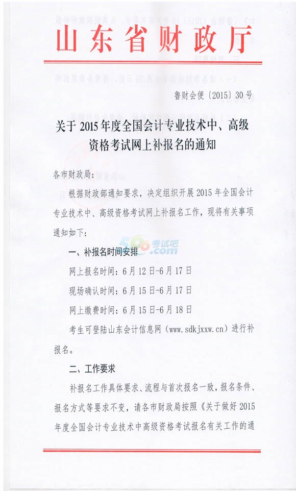 2015山東中級會計職稱補報名時間:6月12日-17日