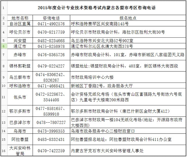 2015年內蒙古各考區中級會計師考試咨詢電話