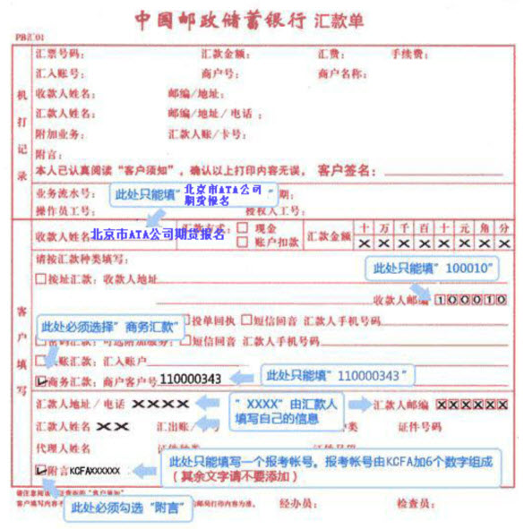 (郵編:100010,收款人:北京市ATA公司期貨報名,匯款方式:商務匯款,商戶客戶號:110000343)