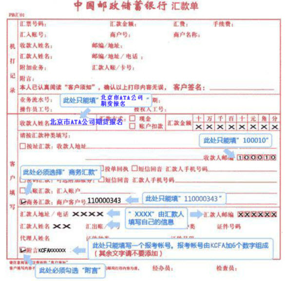 (郵編:100010,收款人:北京市ATA公司期貨報名,匯款方式:商務匯款,商戶客戶號:110000343)