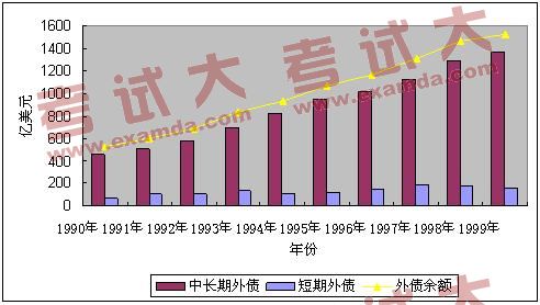 由圖5-5可看出,中國外債增長幅度較大,外債規模不斷擴大,從圖中我們看到,外債余額一直呈增長勢頭。1999年外債余額相當于1990年余額的近3倍,從圖中可以估計出1999年外債余額約1500億美元,1990年約500億美元。