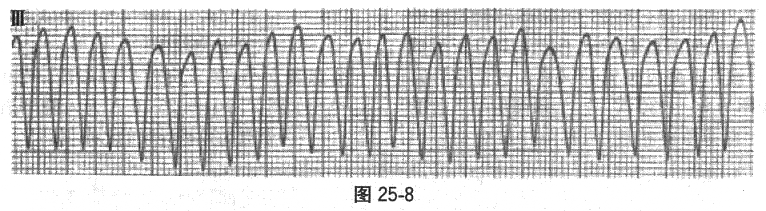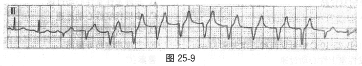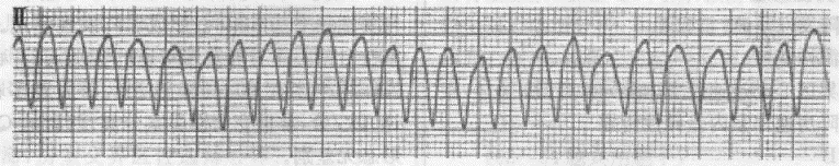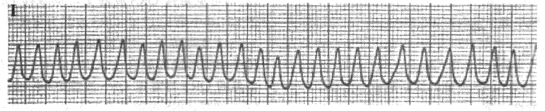 | 正確答案:1.;2. 解題思路:該ECG見QRS波群寬大畸形,節(jié)律絕對不整齊,無明確的P波,故初步診斷為房顫心律,QRS波群寬大畸形的原因可能有旁道前傳、束支傳導(dǎo)阻滯及室內(nèi)差異性傳導(dǎo)幾種情況,考慮本患者既往心電圖提示為A型預(yù)激綜合征,且心動過速時心電圖的QRS波群方向與預(yù)激波方向相同,本圖心室率極快,可見艿波,提示為旁道前傳,如房顫通過房室結(jié)下傳,由于在房室結(jié)內(nèi)發(fā)生隱匿性傳導(dǎo),心室率一般不會如此之快。由于心動過速時心室率極快,患者血壓60/30mmHg,提示血流動力學(xué)不穩(wěn)定,這種情況下可能演變?yōu)槭翌澏霈F(xiàn)阿一斯綜合征,必須做緊急處理,首選同步直流電復(fù)律,而靜注西地蘭或異搏定有縮短旁道不應(yīng)期而進一步加快心室率的可能,一般寬QRS博心動過速時應(yīng)慎用。預(yù)激綜合征患者旁道前傳不應(yīng)期一般較長,長于房室結(jié)不應(yīng)期,而少數(shù)患者旁道不應(yīng)期很短,房顫時可從旁道前傳而引起極快的心室率,并容易引起室顫,臨床應(yīng)引起注意。一般房顫時伴有寬大QRS波,心室率>200次/分時應(yīng)考慮旁道前傳的可能。 |