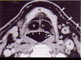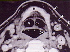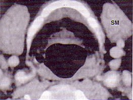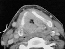 | 男,55歲,聲嘶6年,有長期吸煙史。檢查:無呼吸困難。喉鏡檢查:聲帶慢性充血,可見右側(cè)聲帶可見菜花樣新生物,右側(cè)聲帶活動(dòng)固定,喉部CT檢查如下圖: |