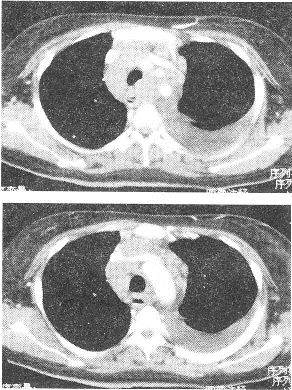 患者男性,咳嗽、咳痰6個月余,胸痛、乏力1個月。查體:左下肺呼吸音無。X線平片示:上縱隔影增寬,左側(cè)中量胸腔積液。胸部CT如圖所示:![]() |