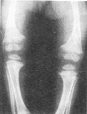 患兒女性,2歲,睡眠差、哭鬧、易出汗;雙腿呈"O"形。X線平片如圖所示。![]() |