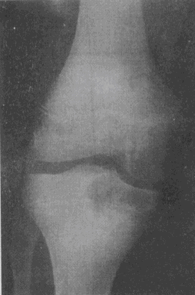 4.男,17歲。右膝關節疼痛1個月余,輕度腫脹。X線片示脛骨近端圓形骨質破壞(如圖),應考慮的診斷是