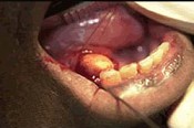| 男性,36歲。進食時左側頜下區(qū)腫脹疼痛,進食后數(shù)小時方可逐漸消退。下頜下腺導管開口處紅腫,輕壓腺體導管口溢膿。 |
