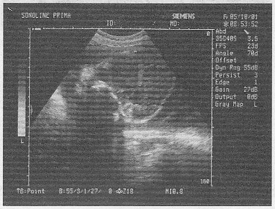 2.女,29歲,停經(jīng)28周,產(chǎn)前超聲檢查如圖,最可能的診斷為![]() |