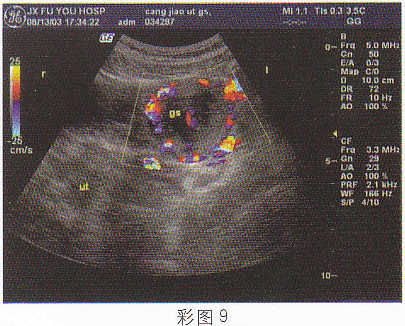 4.女,28歲,停經46天,陰道不規則出血5天,血HCG68μg/ml,結合超聲圖像,最可能的診斷為(彩圖9)![]() |