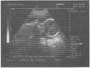 1.女,26歲,停經(jīng)23周產(chǎn)前B超檢查如圖,結(jié)合超聲圖像,最可能的診斷為