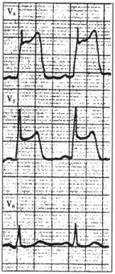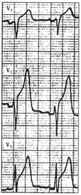 3.患者男性,59歲,高血壓病史4年余,近1月活動后有胸骨后悶痛感,休息可緩解。今因情緒激動又感胸骨后疼痛,昕診心率為120次/分,心電圖檢查如下圖所示,應考慮為![]() ![]() |