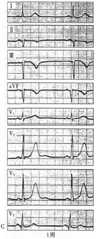 正確答案:E 解題思路:本圖系患者胸痛發作后2小時、24小時及1周的心電圖。下圖A顯示:Ⅱ、Ⅲ、aVF導聯的ST段顯著抬高,出現病理性Q波,是急性下壁心肌梗死的表現。另外,Vz導聯的R波異常增高,ST段壓低,T波直立,提示可能還合并后壁心肌梗死。為了進一步證實后壁心肌梗死,應加做V ~V 導聯。下圖B和下圖C顯示急性下、后壁心肌梗死的演變過程。圖中V 、V 導聯QRS波群由rS型演變為Rs型,進一步證實存在后壁心肌梗死。 |