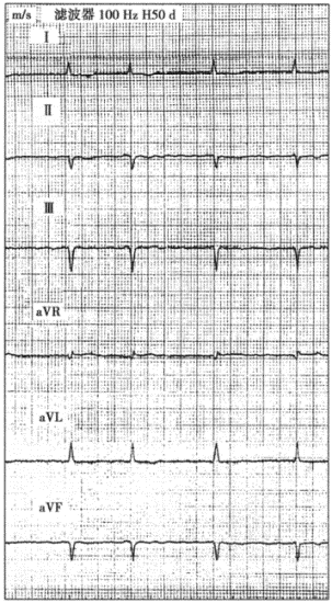2.患者男性,40歲,擴張型心肌病。心電圖如下圖所示,與該心電圖表現不符合的診斷是![]() ![]() |