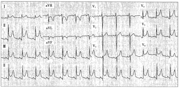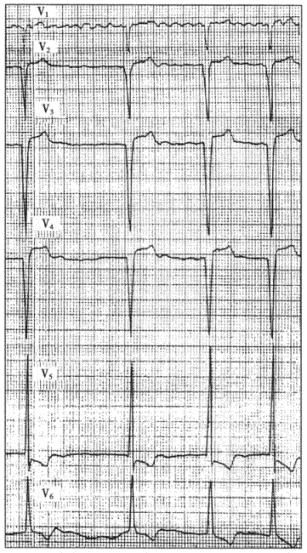 患者男性,35歲,因胸痛、咳嗽2天就診,急查心電圖如下圖所示。心肌壞死標志物正常,超聲心動圖提示少許心包積液,臨床診斷為急性心包炎。![]() |