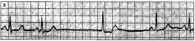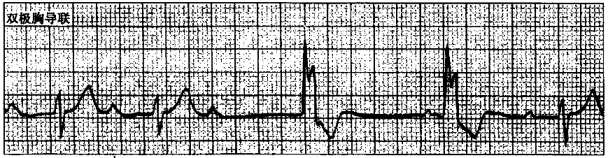 | 正確答案:B 解題思路:本圖第3、4個延遲出現(xiàn)的QRS波群寬大畸形,其前無相關的P波,符合室性逸搏的診斷。 |