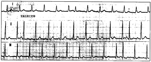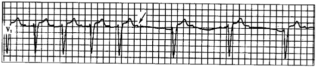 患者女性,56歲,頭暈、心悸3天就診。心電圖如下圖所示。![]() |