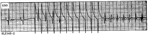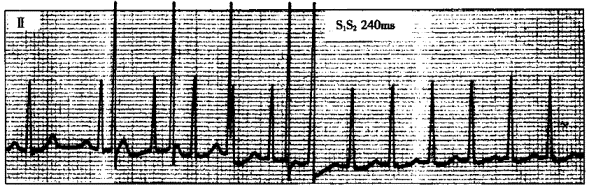 患者男性,18歲,反復(fù)發(fā)作心悸5年。食管心房調(diào)搏檢查記錄到圖4-7-8和圖4-7-9。![]() ![]() ![]() ![]() |